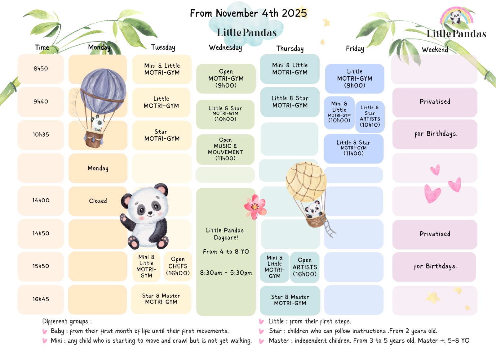 Each child possesses unique qualities and develops at their own pace. At LittlePandas, your place for Kids Activities in Geneva, we recognize and cater to these individual needs by offering kids activities in the city that are tailored to each child’s motor development, rather than solely based on their age. We have curated different groups to accommodate children of various stages.