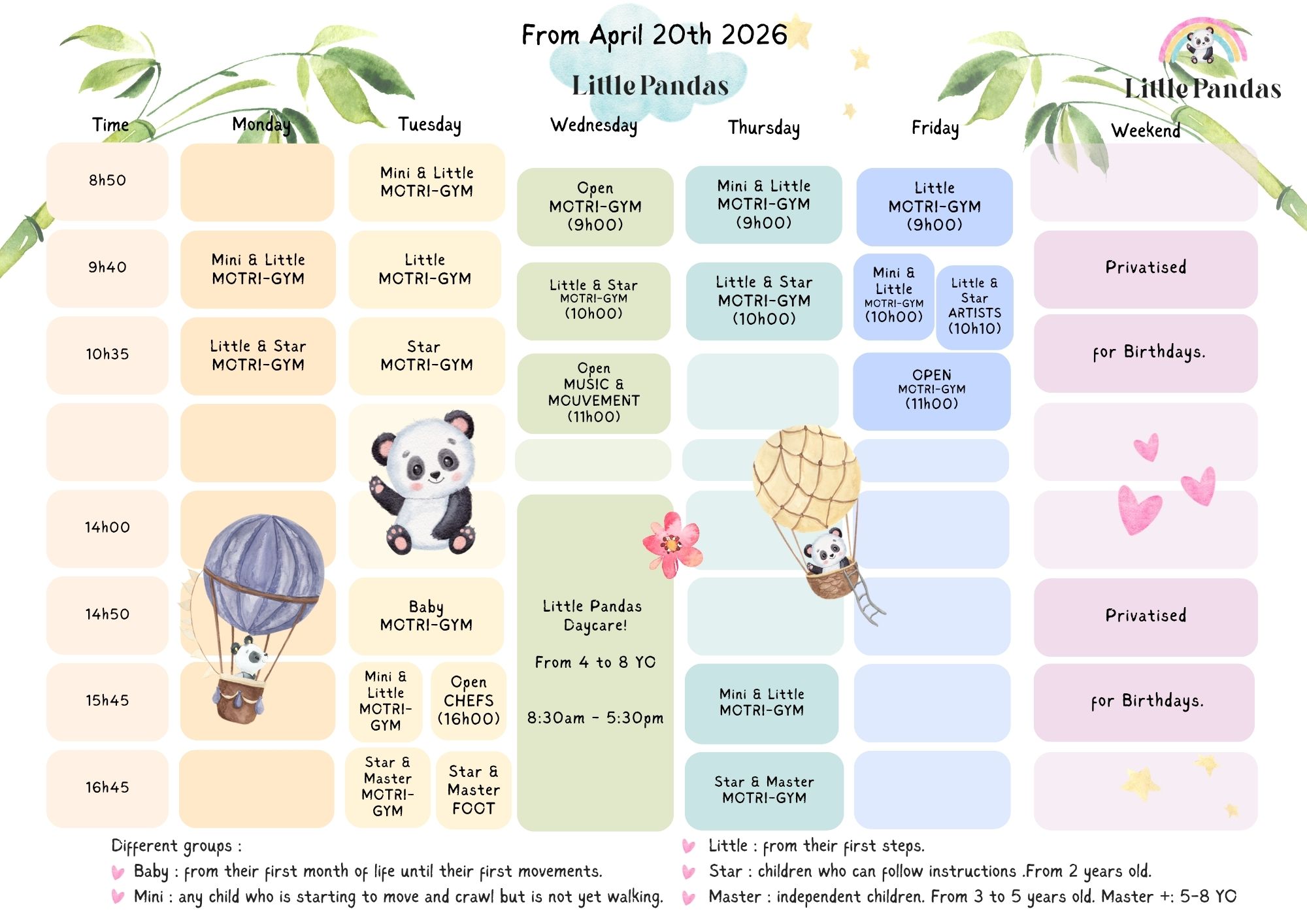 Each child possesses unique qualities and develops at their own pace. At LittlePandas, your place for Kids Activities in Geneva, we recognize and cater to these individual needs by offering kids activities in the city that are tailored to each child’s motor development, rather than solely based on their age. We have curated different groups to accommodate children of various stages.